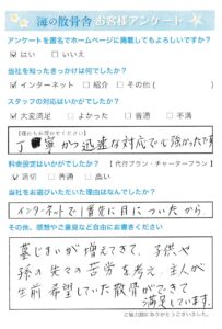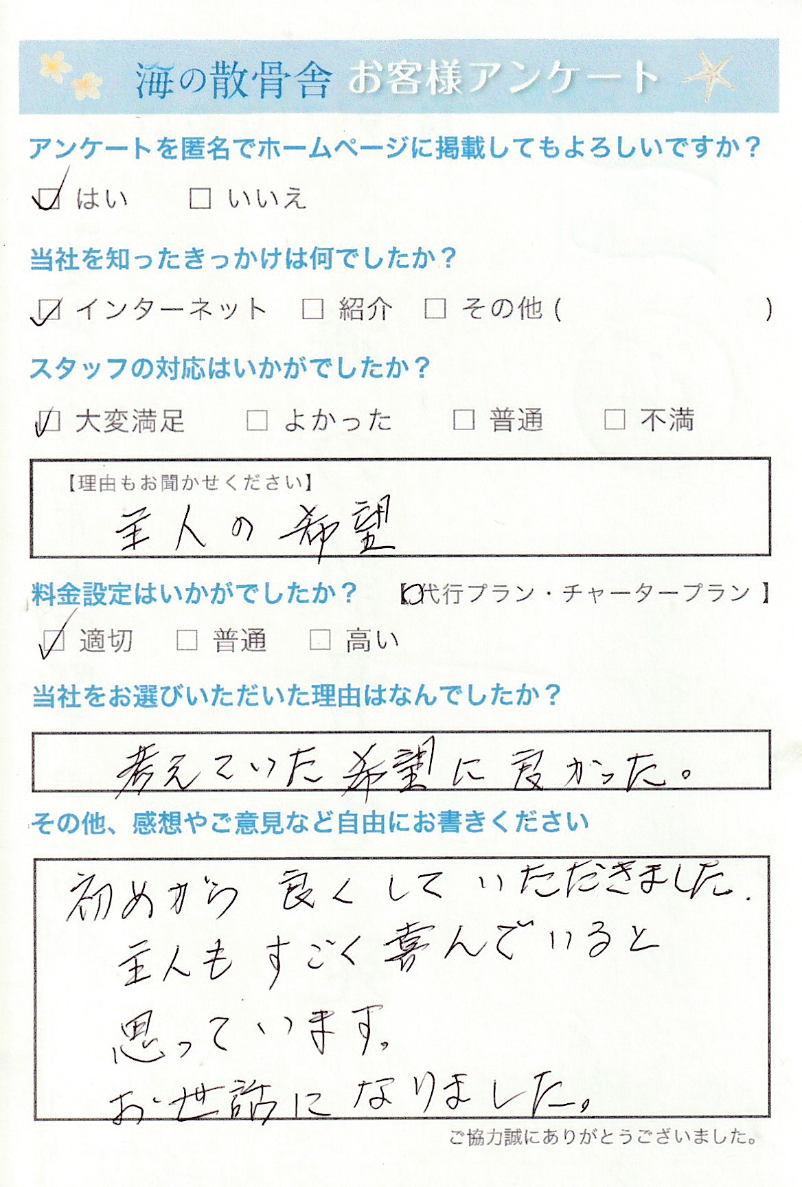 ご主人様のご希望とのことでお喜びになっていることと存じます。海洋散骨は故人様の意思を尊重し、その人らしい生き方や最期を叶えることができます。これまでのお墓に入るという方法にとらわれず、自然に還るという観念から新しい葬送として増えています。 弊社では初めての方にも丁寧にご安心いただけるよう対応しております。この度はアンケートにご協力いただき誠にありがとうございます。