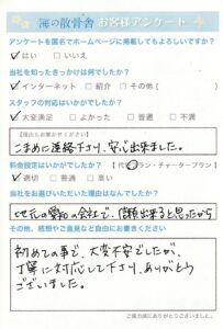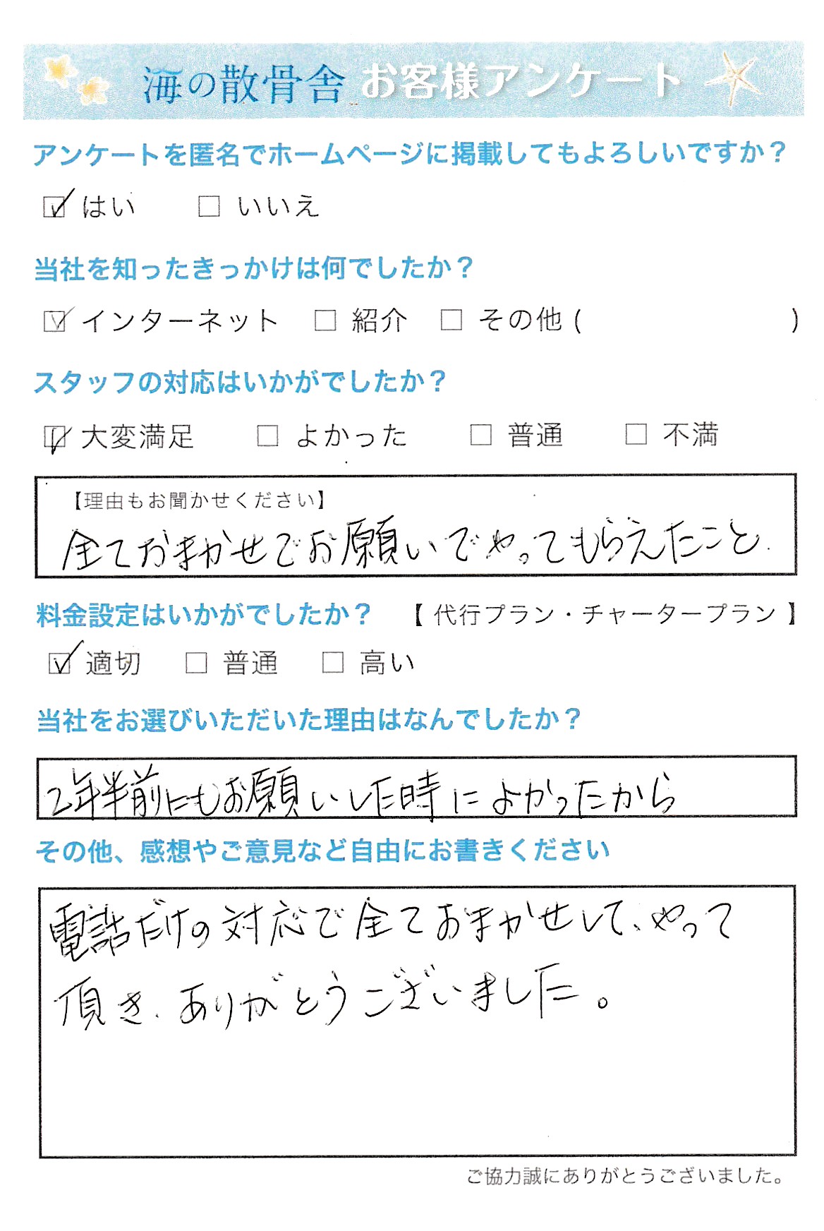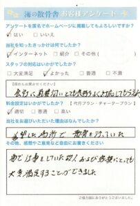 2年半前にも弊社をご利用いただきまして誠にありがとうございます。 弊社へご来社が難しい場合は、お電話にてお打合せをさせていただきます。初めての方にも丁寧にご説明させていただきますのでわかりやすいとお客様からお声をいただいております。この度はアンケートにご協力いただき誠にありがとうございます。