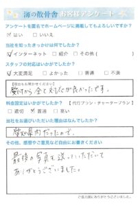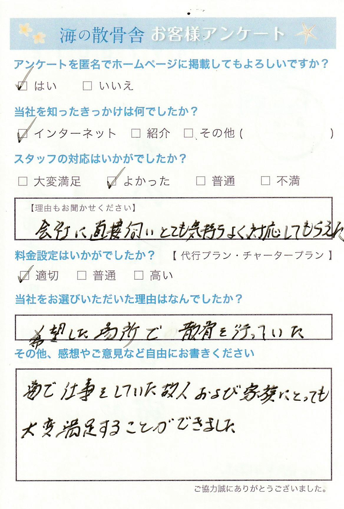 弊社の事務所にてお打合せのご訪問いただき誠にありがとうございます。散骨のイメージをしっかりと持っていただけるように経験豊富なスタッフが丁寧にご説明いたします。直接ご訪問いただいて、説明し質問にお答えさせていただくのが不安解消につながるかと思います。お電話にてご相談、お打合せも対応しておりますので安心してお任せください。 故人様の想い出の海で散骨させていただきましたので、故人様にとって何よりの供養となると信じております。 この度はアンケートにご協力いただき誠にありがとうございます。