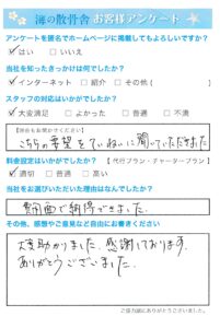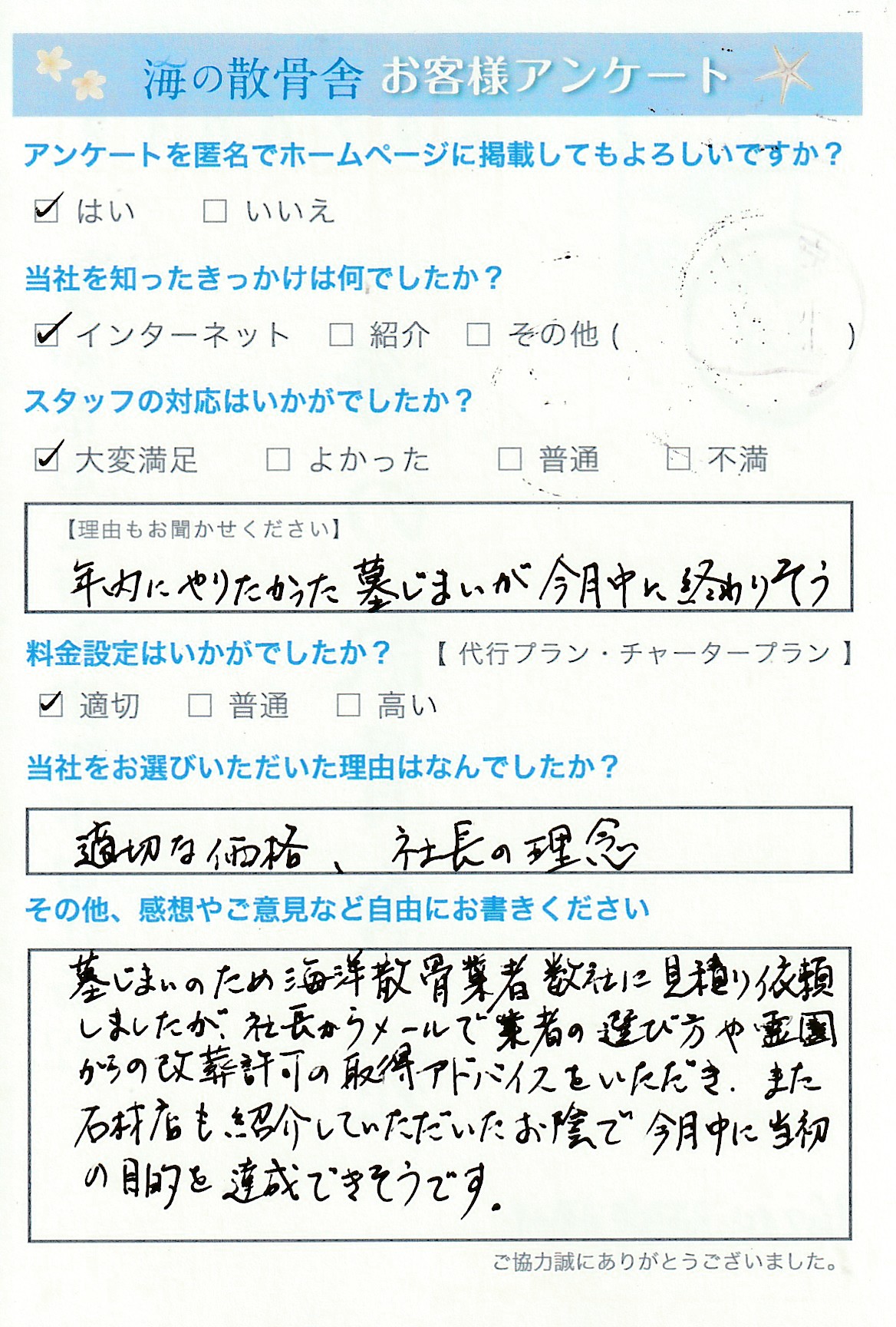 このたびは温かいお言葉をお寄せいただき、誠にありがとうございます。 年内に墓じまいを終えたいというご希望に添う形でお手伝いできましたこと、スタッフ一同大変うれしく思っております。私どもは今後も「安心・誠実・丁寧」を大切に、一つひとつのご供養に真心を込めて取り組んでまいります。今後もご先祖様への想いを大切に、皆様に安心してご依頼いただけるよう努めてまいります。