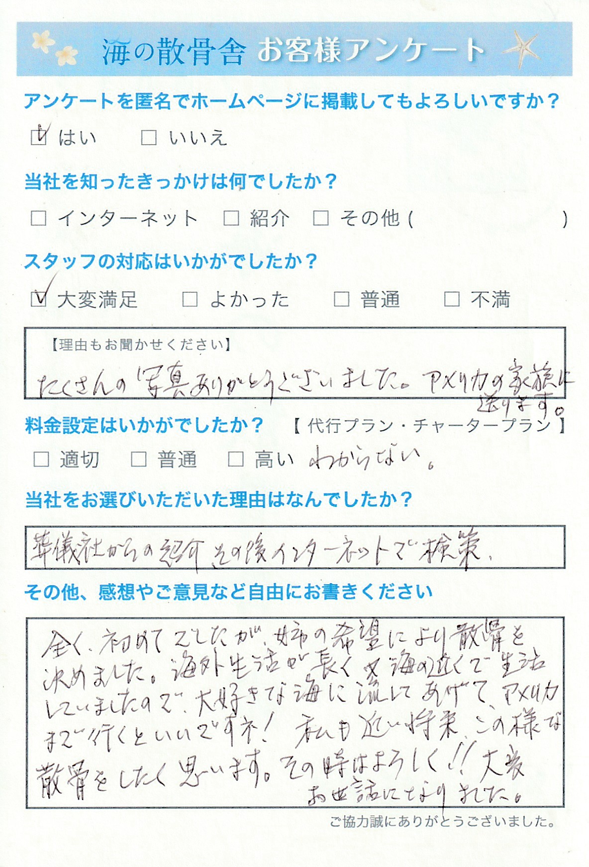 このたびは海洋散骨のご依頼を賜り、また心温まるお言葉をお寄せいただき誠にありがとうございます。 大切なお姉様のご希望を尊重され、海への旅立ちをお手伝いできましたこと、スタッフ一同心より感謝申し上げます。 お写真をご家族の皆様と共有いただけるとのこと、大変嬉しく存じます。 海のそばで過ごされた故人様にとって、広い海原への旅立ちはきっと安らぎに満ちたものであったことと思います。 アメリカのご家族様にも、そのお気持ちが海を越えて届きますようお祈り申し上げます。 また、「将来自分もこのように」とのお言葉を頂戴し、深いご信頼を感じ大変光栄に存じます。 これからも、ご家族それぞれの想いに寄り添い、安心してお任せいただける散骨のお手伝いができますよう努めてまいります。 改めまして、このたびのご縁と温かいお言葉に心より感謝申し上げます。