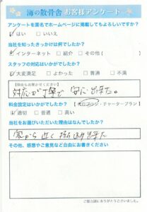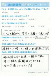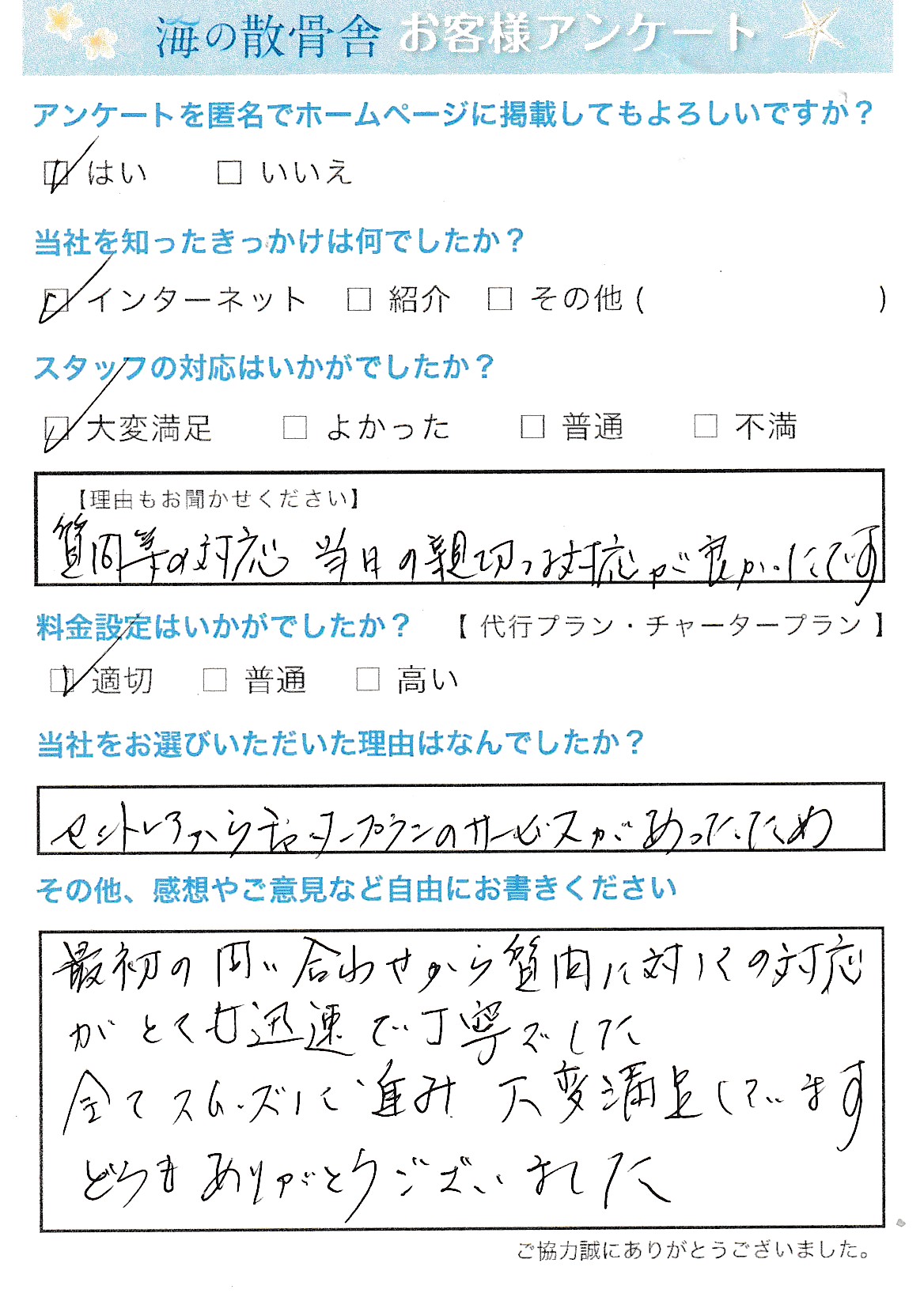 このたびは、弊社の海洋散骨サービスをご利用いただき、また温かいお言葉をお寄せいただき誠にありがとうございます。 チャータープランを通じて、大切な故人様をお見送りするお手伝いができましたこと、大変光栄に存じます。 また、お問い合わせ時から当日のご案内まで、対応にご満足いただけたとのお言葉を頂戴しスタッフ一同心より嬉しく思っております。 今後も、お客様のご希望に寄り添い、安心してお任せいただける散骨サービスを提供してまいります。 このたびは誠にありがとうございました。