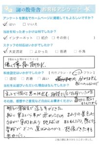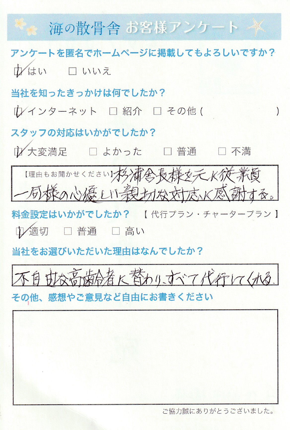 このたびは温かいお言葉をお寄せいただき、誠にありがとうございます。 社長をはじめ従業員一同、お客様にご満足いただけたことを何より嬉しく感じております。 今後もご高齢の方やお手伝いを必要とされる皆さまに安心してご利用いただけるよう、心をこめた丁寧な対応を大切にしてまいります。 お客様のお声を励みに、より良いサービスのご提供に努めてまいります。この度はアンケートにご協力いただき誠にありがとうございます。