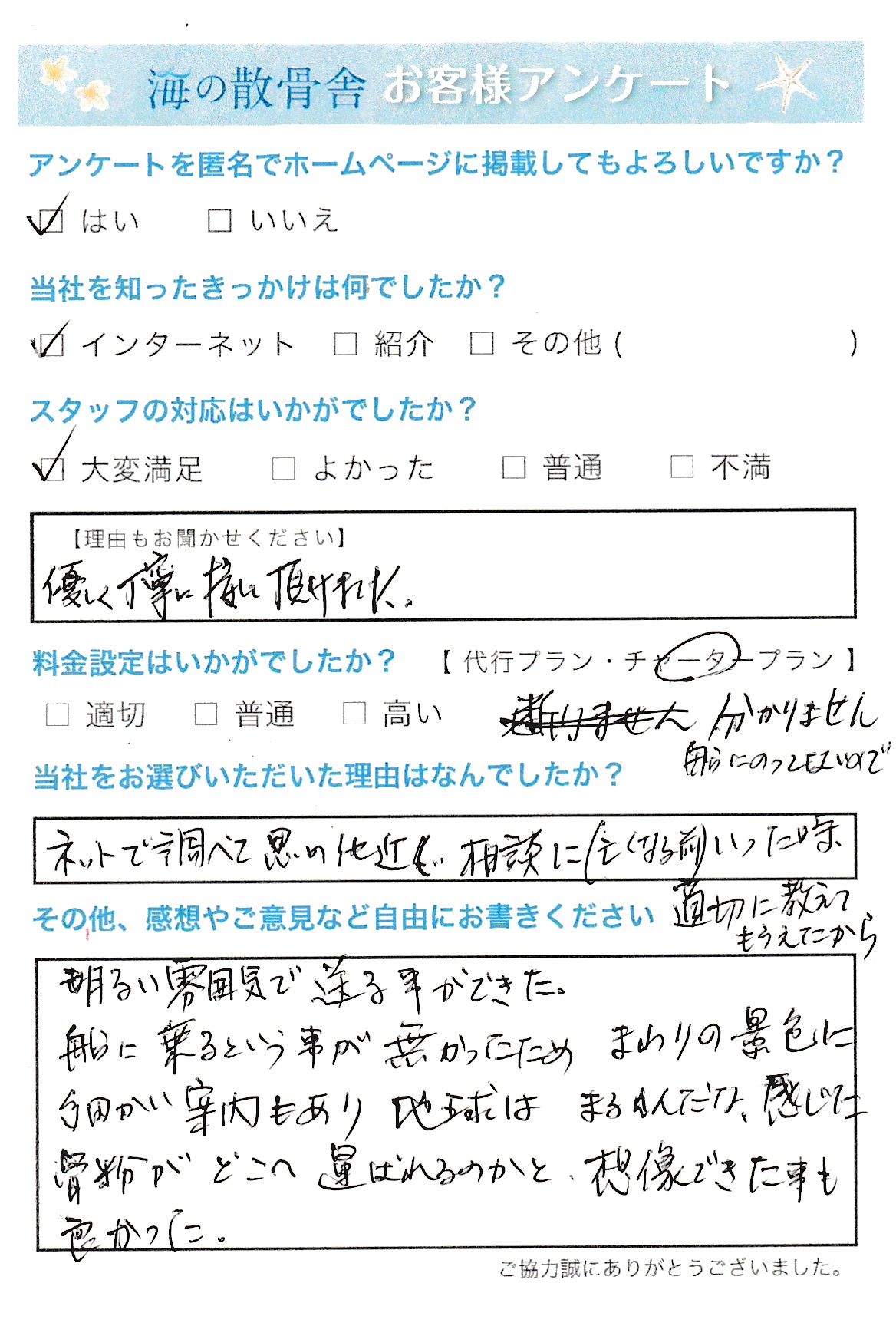 このたびはご利用いただき、また心温まるお言葉をお寄せいただき誠にありがとうございます。 明るい雰囲気の中でお見送りいただけたこと、そして景色やご案内を通じて自然の大きさを感じていただけたとのこと、大変嬉しく拝見いたしました。 粉骨の行方にも安心してお心を寄せていただけたとのお言葉に、スタッフ一同励まされております。 今後も皆さまに穏やかなお気持ちでお見送りいただけるよう、心を込めてお手伝いしてまいります。