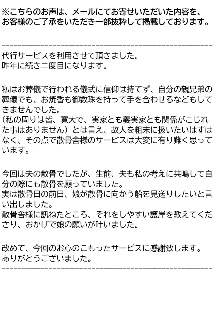 このたびは代行散骨サービスをご利用いただき、温かいメッセージをお寄せくださりありがとうございます。 昨年に続き二度目のご依頼をいただけましたこと、心より感謝申し上げます。 大切なご主人様のお見送りに寄り添うお手伝いができ、スタッフ一同嬉しく思っております。 前日のご相談によりお嬢様が船を見送ることができたとのお話も拝読し、私どもにとって大きな喜びとなりました。 お客様のお気持ちに寄り添えるサービスを提供できたことを光栄に思っております。 これからも、ご家族の想いに添った安心のサービスを心がけてまいります。