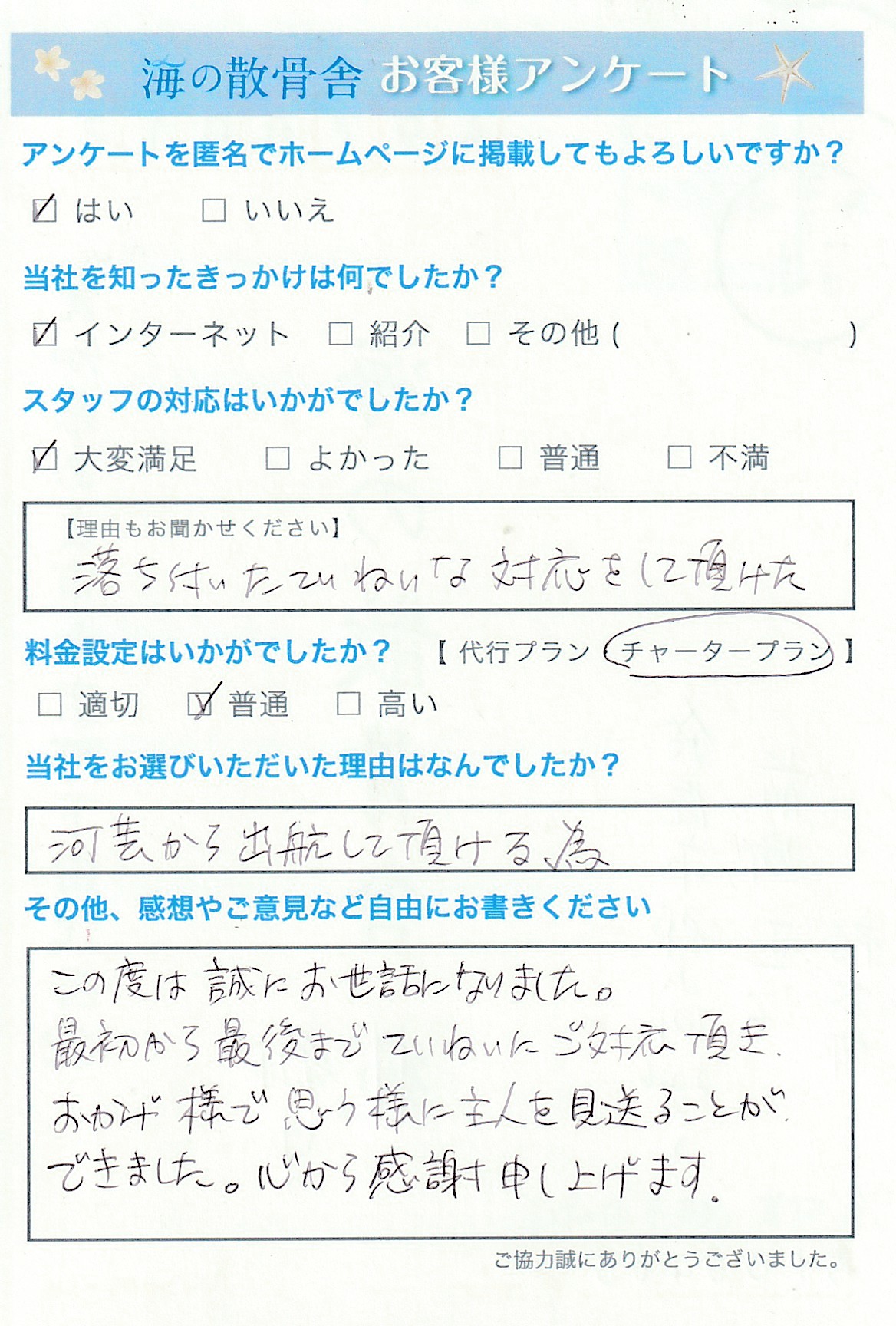 このたびはチャータープランをご利用いただき、また心温まるお言葉をお寄せくださり誠にありがとうございます。 ご主人様のご供養のお手伝いを無事に務めさせていただけましたこと、スタッフ一同安堵しております。 最初から最後まで思い描かれていた形でご主人様をお見送りできたとのお言葉は、私たちにとって何よりの励みでございます。 大切なご家族様の旅立ちに関わる時間をお任せいただき、心より感謝申し上げます。 今後も皆様のお気持ちに寄り添い、安心してご依頼いただけるサービスの提供に努めてまいります。