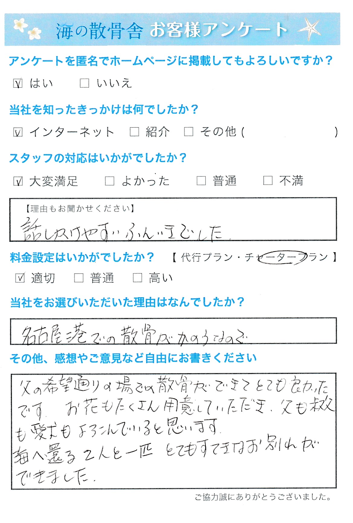 このたびは、アンケートへのご回答ならびに心温まるお言葉を誠にありがとうございます。 名古屋港での散骨をお選びいただき、故人様のご希望を叶えるお手伝いができましたことを、スタッフ一同大変うれしく思っております。 お花につきましてもご満足いただけたようで何よりでございます。 大切なご家族が海へ還られる穏やかで心に残るお別れのお時間となりましたことを、心より願っております。 このたびは誠にありがとうございました。
