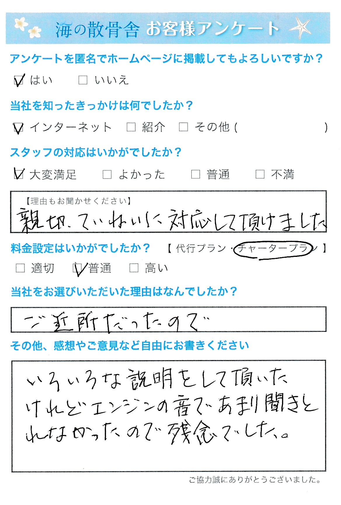 このたびは、アンケートへのご回答ならびに貴重なご意見を誠にありがとうございます。 当社をお近くという理由でお選びいただけましたこと、大変うれしく思っております。 一方で、船のエンジン音により説明が聞き取りづらかったとのこと、申し訳ございませんでした。 いただいたご意見を踏まえ現在は音量について、お客様ご自身でも調整できるよう改善いたしました。 今後も一つひとつのご意見を大切にし、より安心してお任せいただけるよう努めてまいります。
