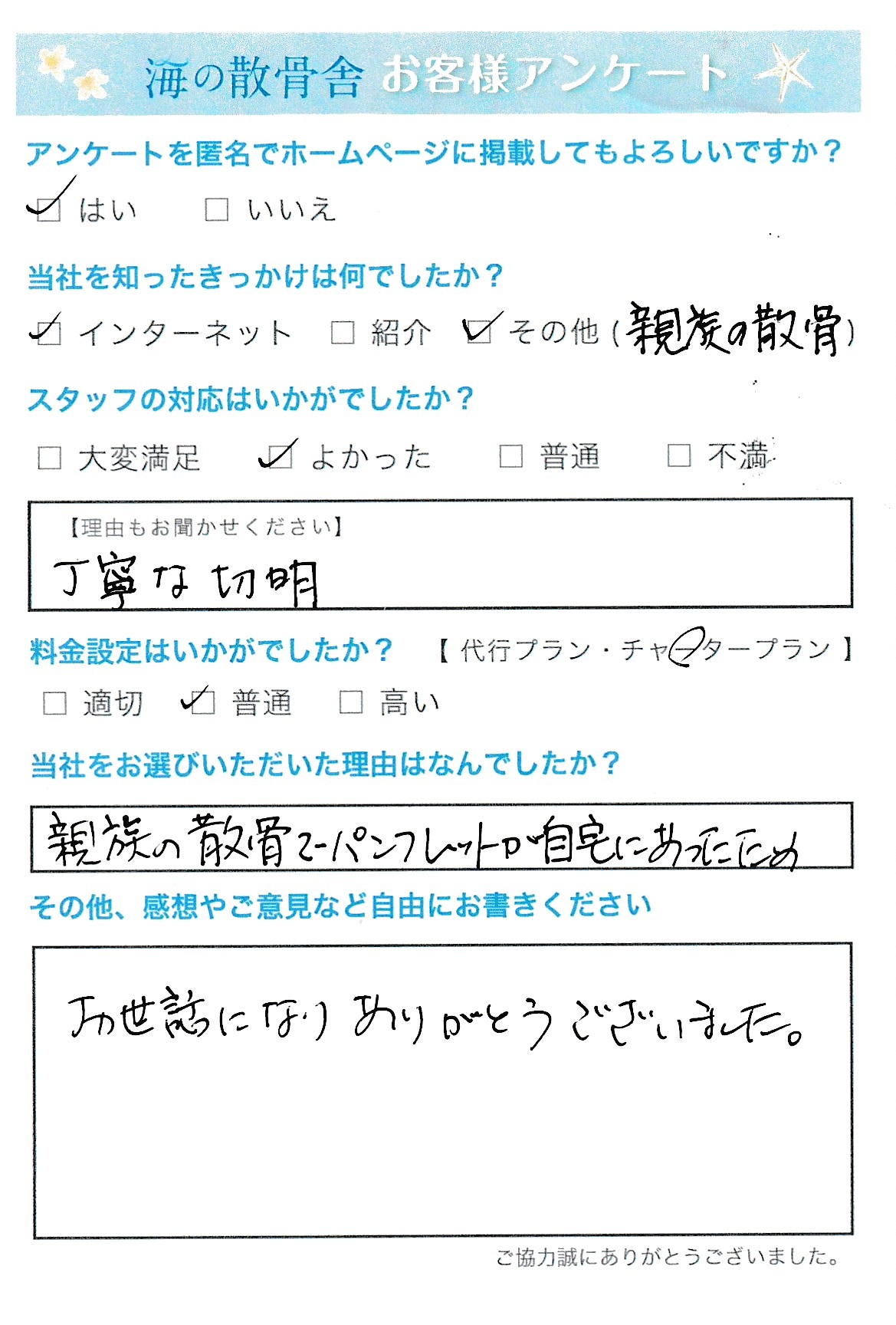 このたびは大切なご供養をお任せいただき、誠にありがとうございました。 また、スタッフの説明についてお褒めの言葉をいただき大変励みになります。 以前のご親族様の散骨をきっかけに、今回も当社をお選びいただけたことを心より感謝申し上げます。 今後もご家族様が安心してお任せいただけるよう、丁寧な対応を心がけてまいります。 ありがとうございました。