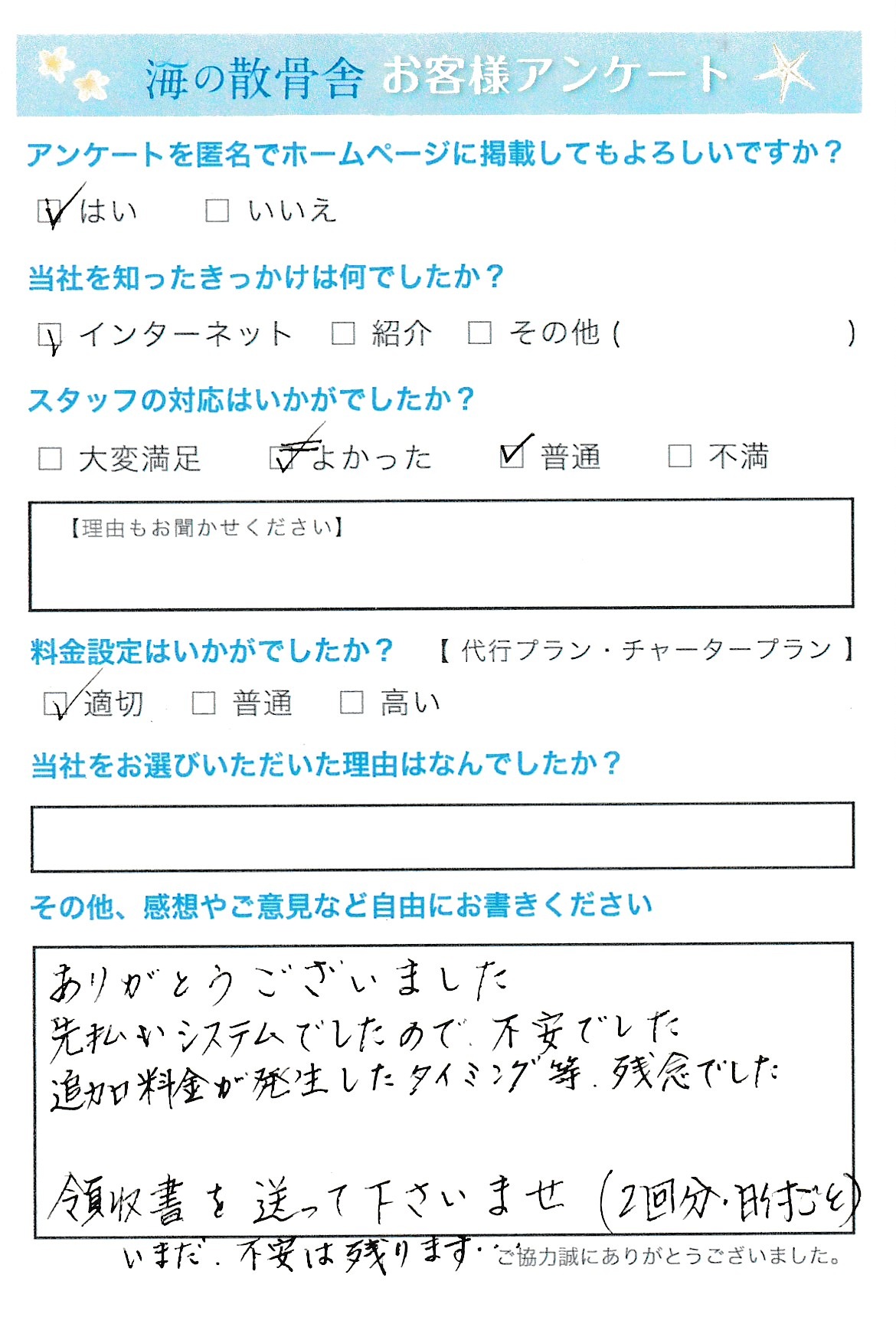 このたびは貴重なご意見をお寄せいただき、誠にありがとうございます。 お支払い方法につきましては個人様からのご依頼においてはサービスの性質上、事前のお支払いをお願いしており当社規定に基づいた対応となっております。何卒ご理解賜りますようお願い申し上げます。 また追加料金につきましては事前にお伺いしておりました骨壺サイズ(5寸)と、実際にお預かりした骨壺(6寸)に差異があったため規定に基づきご請求させていただきました。 サイズに応じた料金設定はご案内している通りでございます。 領収書につきましては、本アンケートにて初めてご連絡を頂戴いたしましたため速やかに発送させていただいております。 今後とも安心してご利用いただけるよう、丁寧なご案内に努めてまいります。
