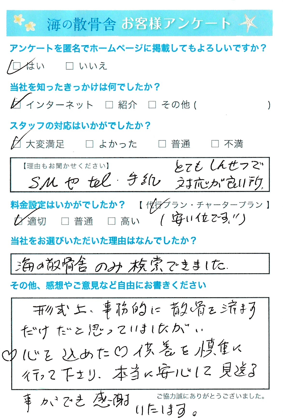 このたびは温かいお言葉をお寄せいただき、誠にありがとうございます。 また、ショートメールやお電話での対応につきご評価をいただき大変嬉しく存じます。 数ある中より当社をお選びいただき、ご縁をいただけましたことに心より感謝申し上げます。 当社では形式的な対応にとどまらず、故人様とご遺族様のお気持ちに寄り添ったご供養を大切にしております。 安心してお見送りいただけたとのお言葉を頂戴し、大変嬉しく存じます。 今後も一つひとつのご縁を大切にし、より安心してお任せいただけるよう丁寧なご案内と心を込めたご供養に努めてまいります。