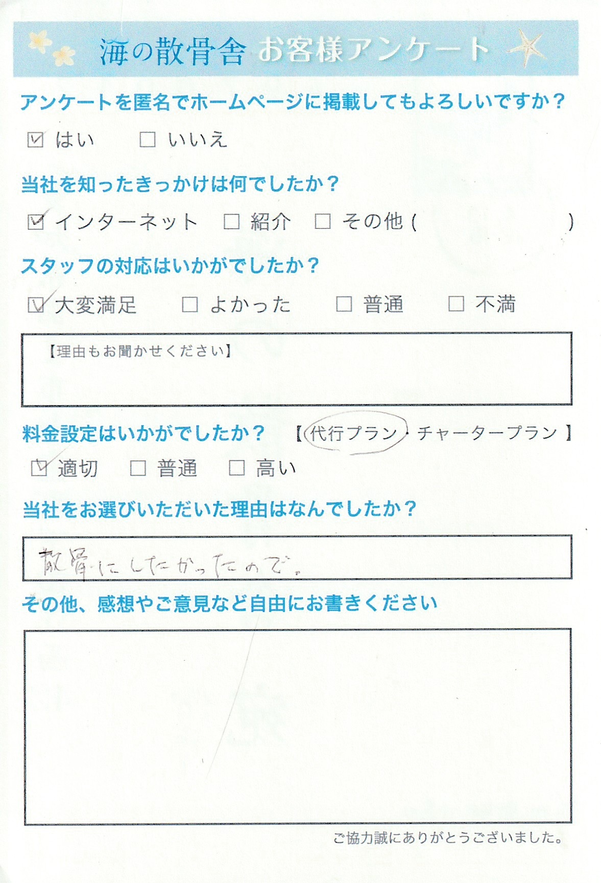 この度は、数ある散骨会社の中から弊社をお選びいただき誠にありがとうございました。 インターネットを通じて弊社をお知りいただき、代行散骨という大切なご供養をお任せいただけましたこと大変光栄に存じます。 スタッフの対応につきまして「大変満足」とのお言葉を頂戴し、何よりの励みとなっております。 これからも、ご遺族様のお気持ちに寄り添い安心してお任せいただけるよう、より一層努めてまいります。 この度は誠にありがとうございました。